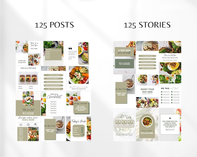 Designed especially for food bloggers, dietitians, nutritionists, and health coaches, this massive bundle includes 125 Instagram post templates and 125 Instagram story templates—all featuring cohesive, mouth-watering designs that elevate your brand’s visual identity.